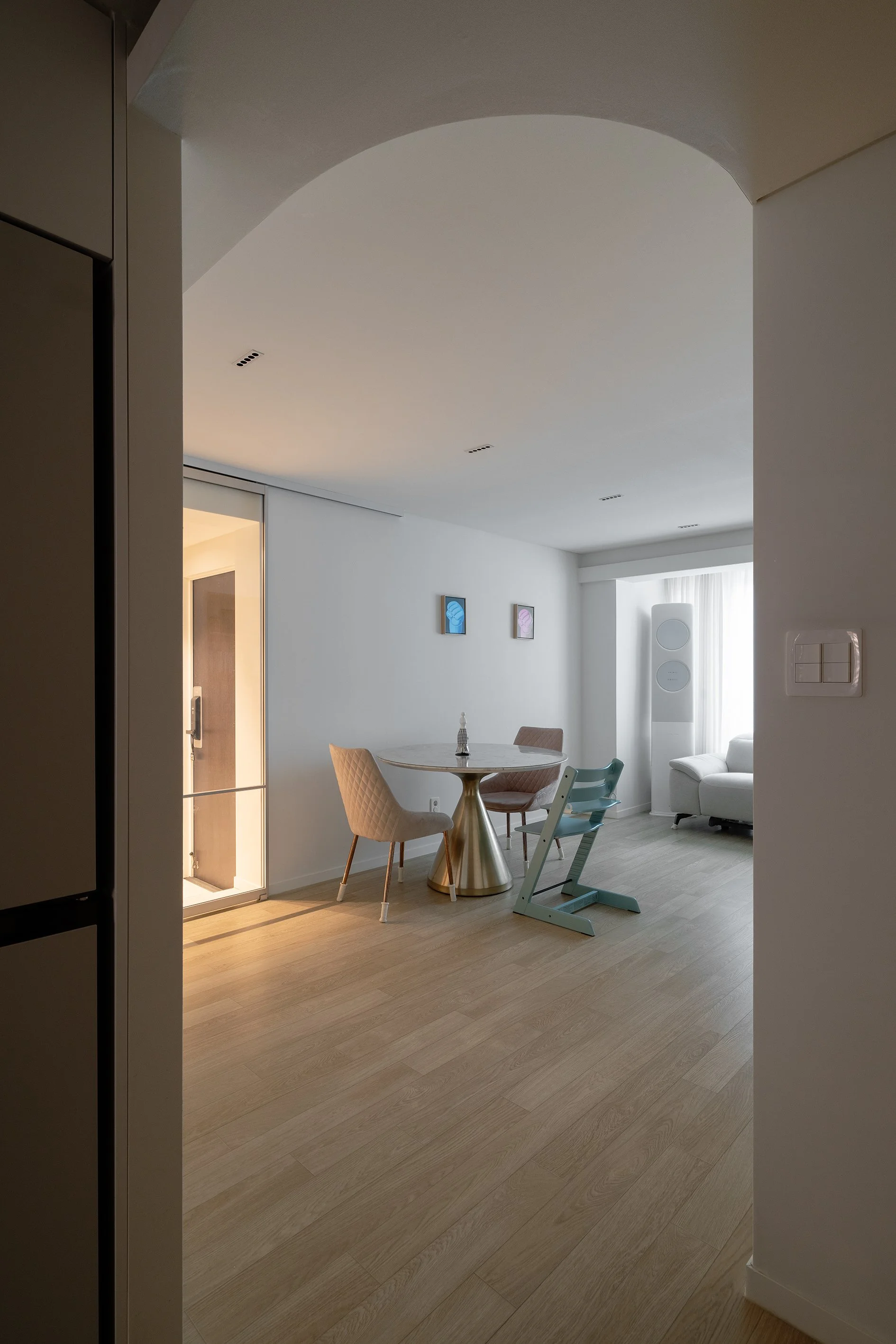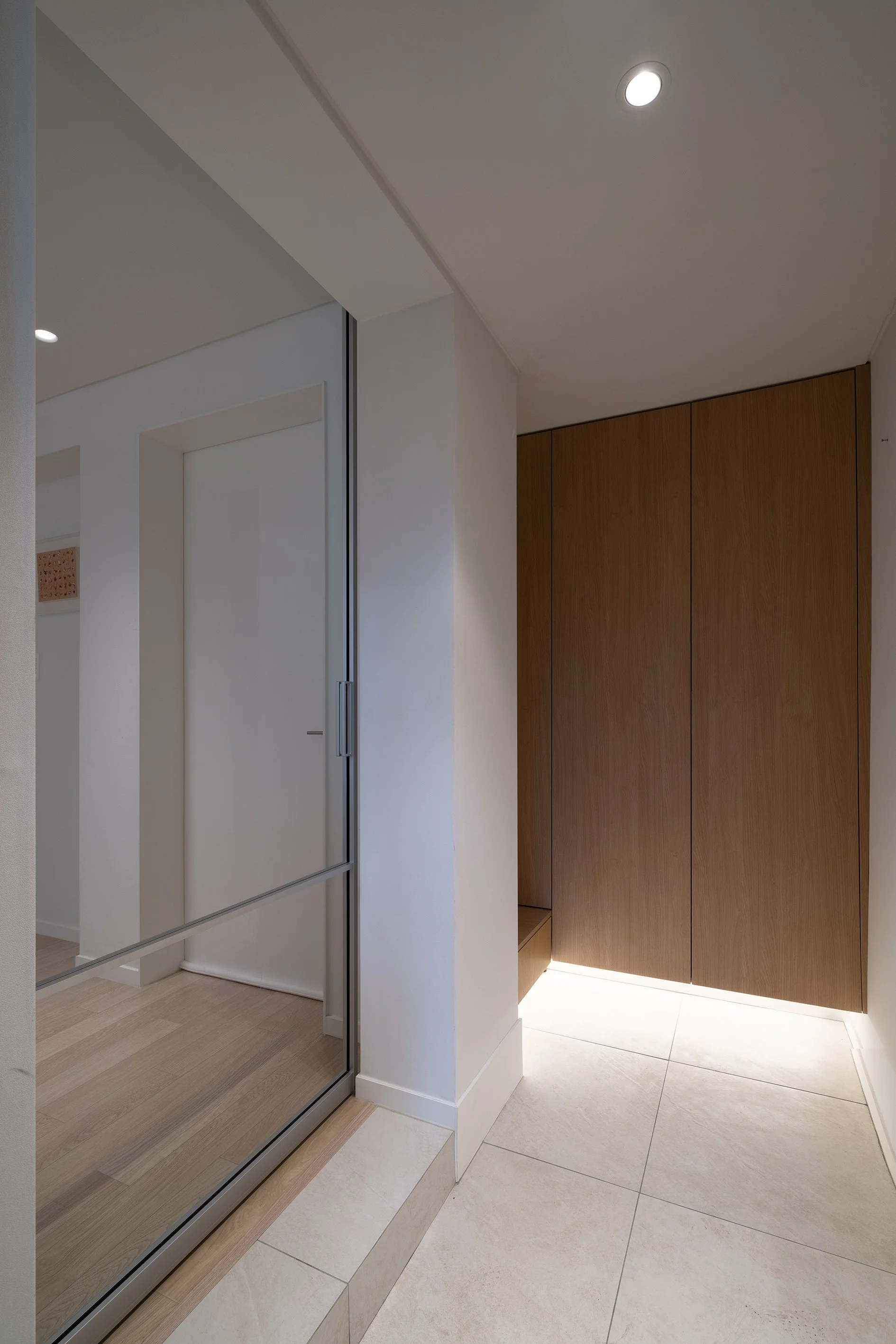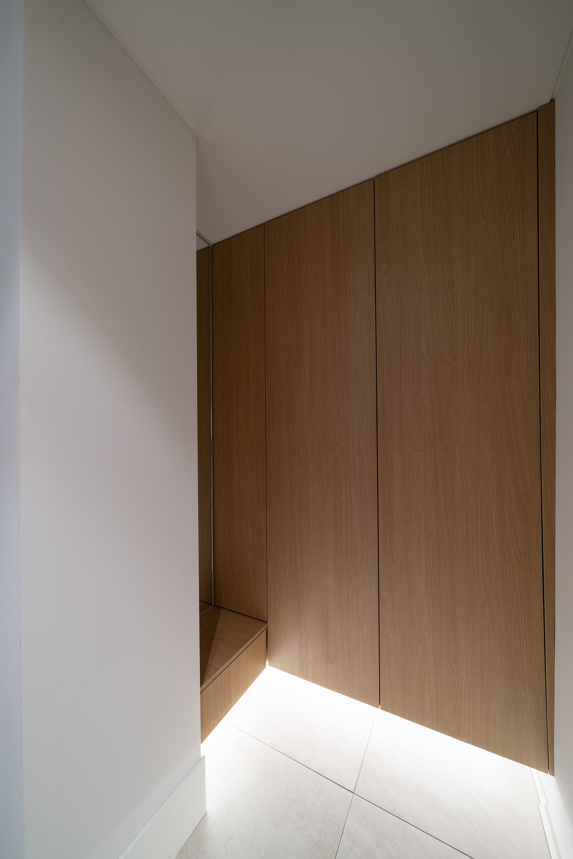 직경 1m 내외의 공간으로 유모차 보관은 물론 신발 신는 것 마저 협소하여 기존 신발장과 벽체를 철거하고 이를 약 1m 뒤로 후퇴 재설치하여 진입 시 깊이와 여유 공간을 확보하였다.