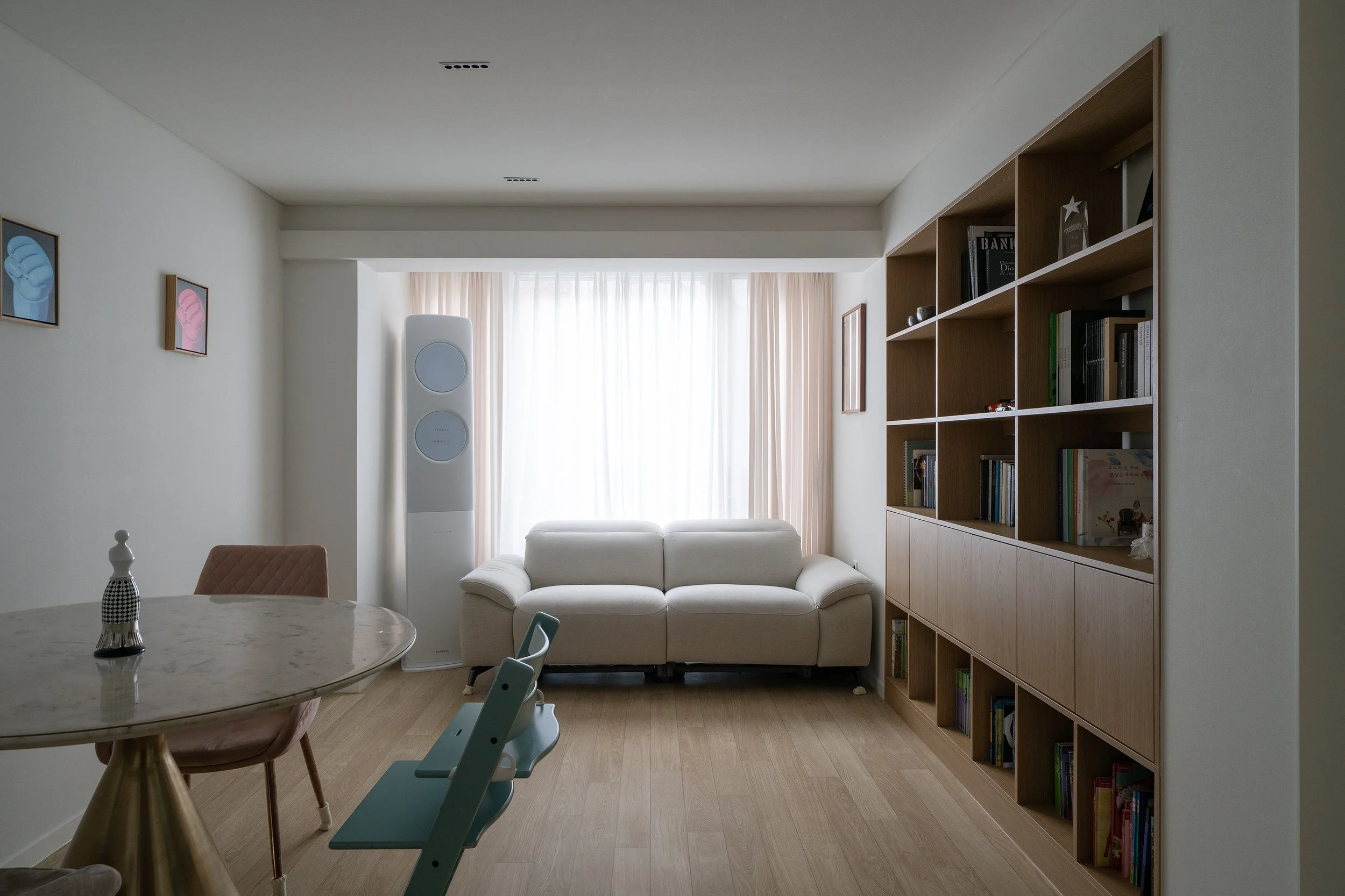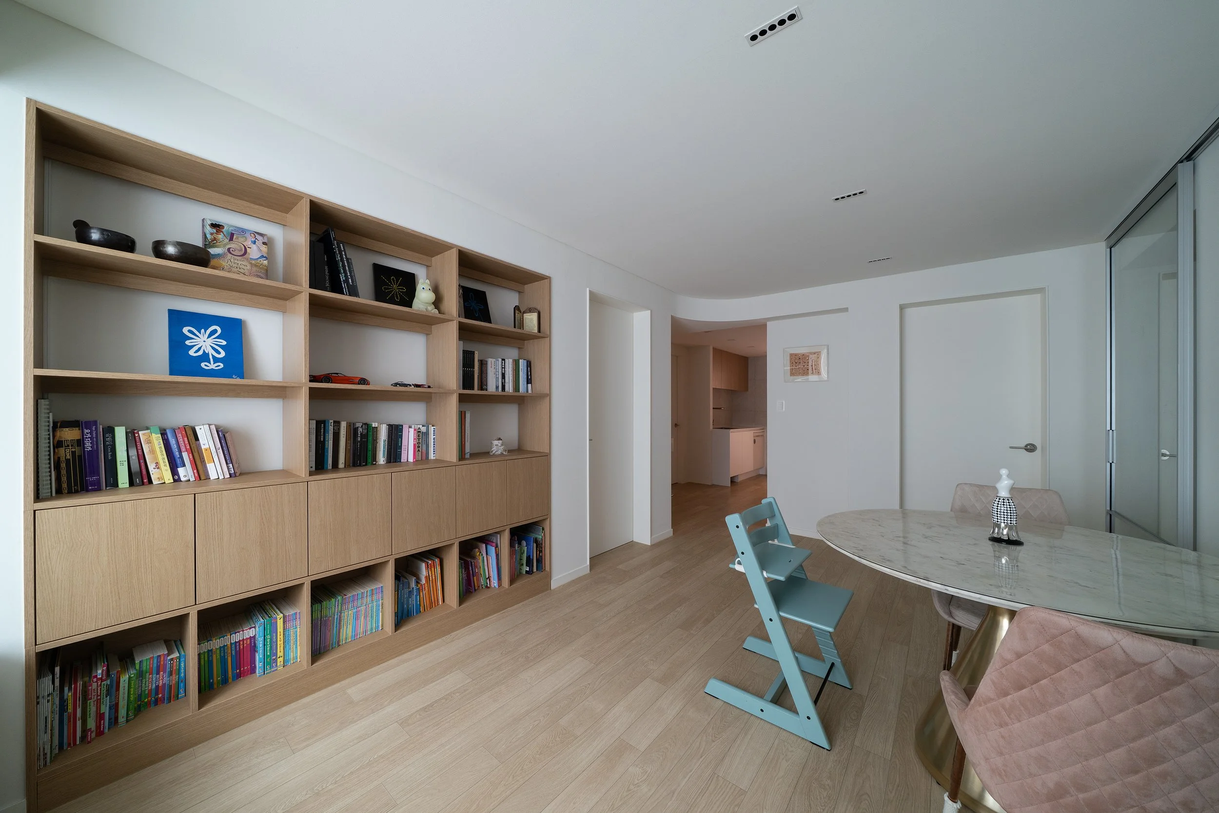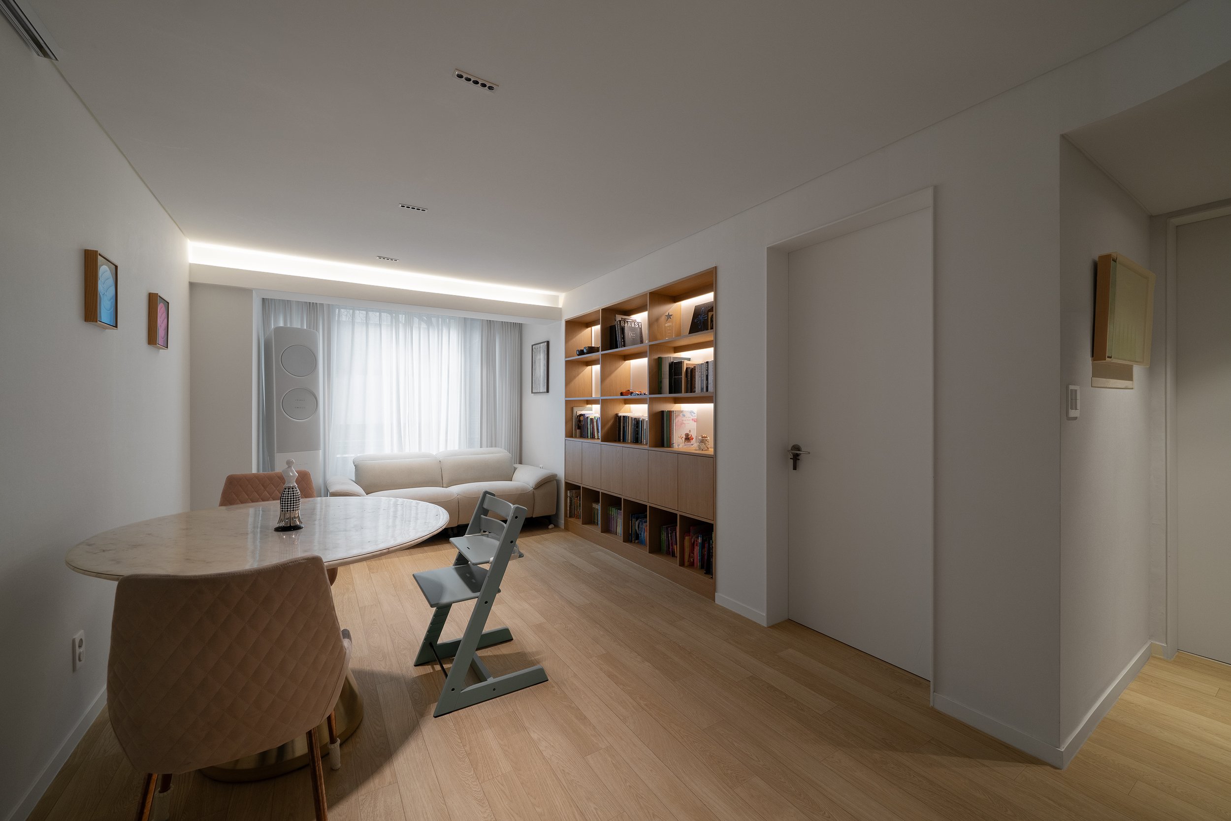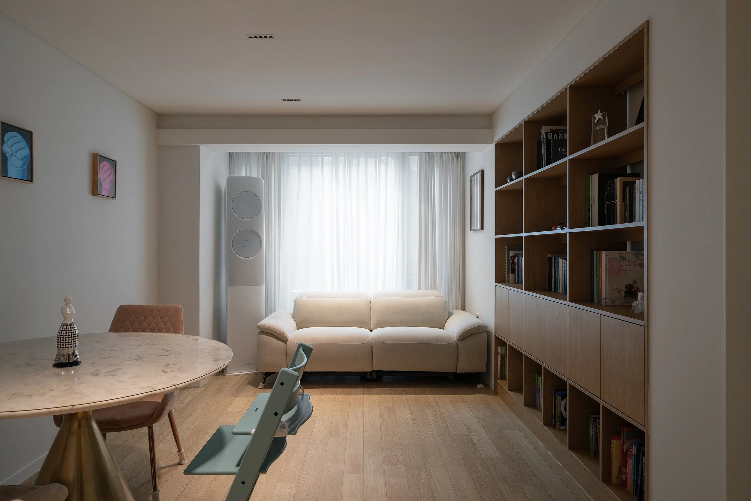 식탁과 카우치 외 별도의 집기가구를 배치하기 협소한 거실의 관리와 장식을 위해 벽면에 책장과 하부장을 매립 설치하였다. 작은 천장을 그나마 넓어 보이기 천장조명을 다이닝 기능을 중심으로 최소한으로 사용하여 천장면을 깨끗하게 유지하고 책장 간접조명의 측광을 활용하여 부족한 조도를 확보하였다.