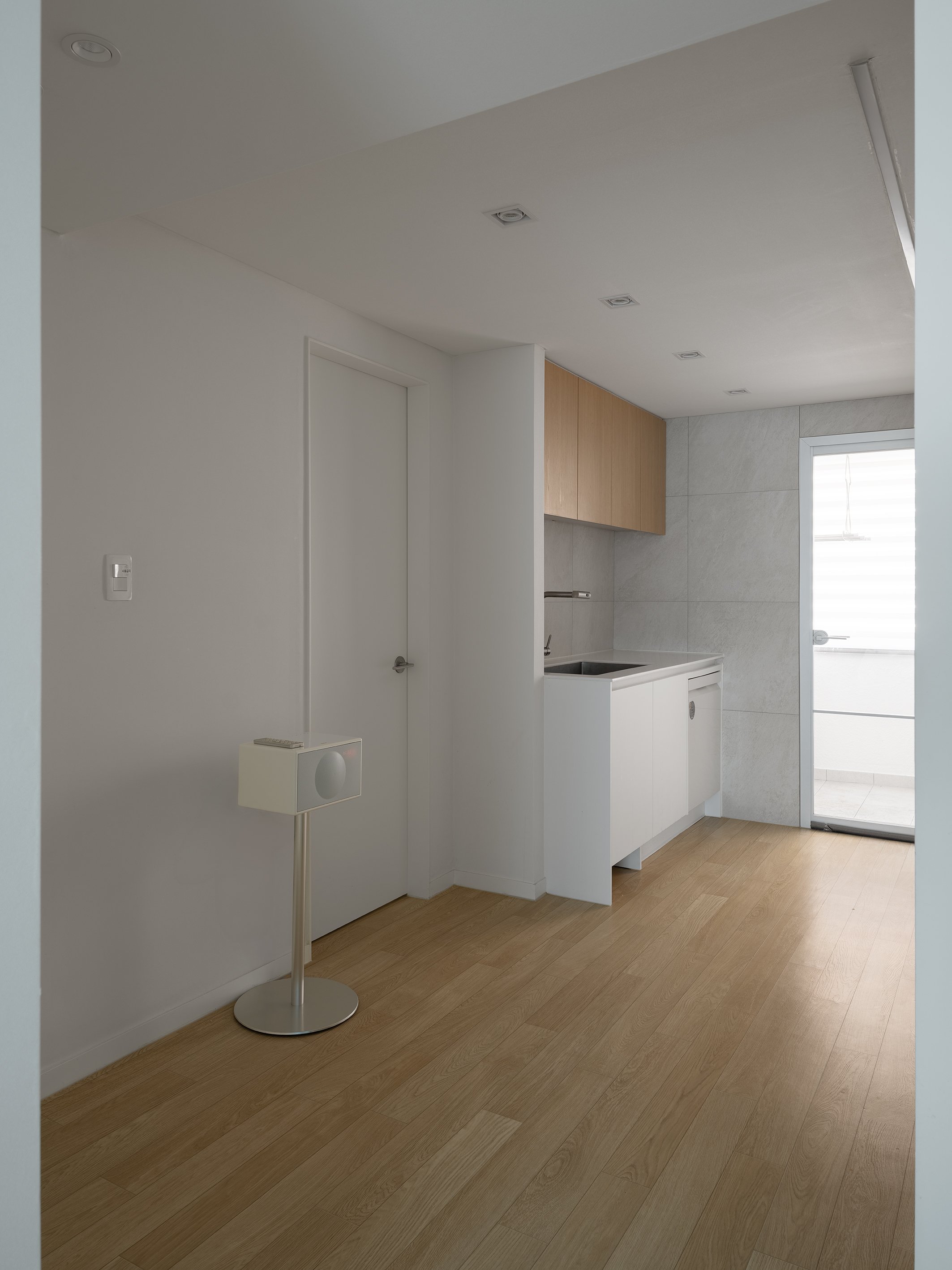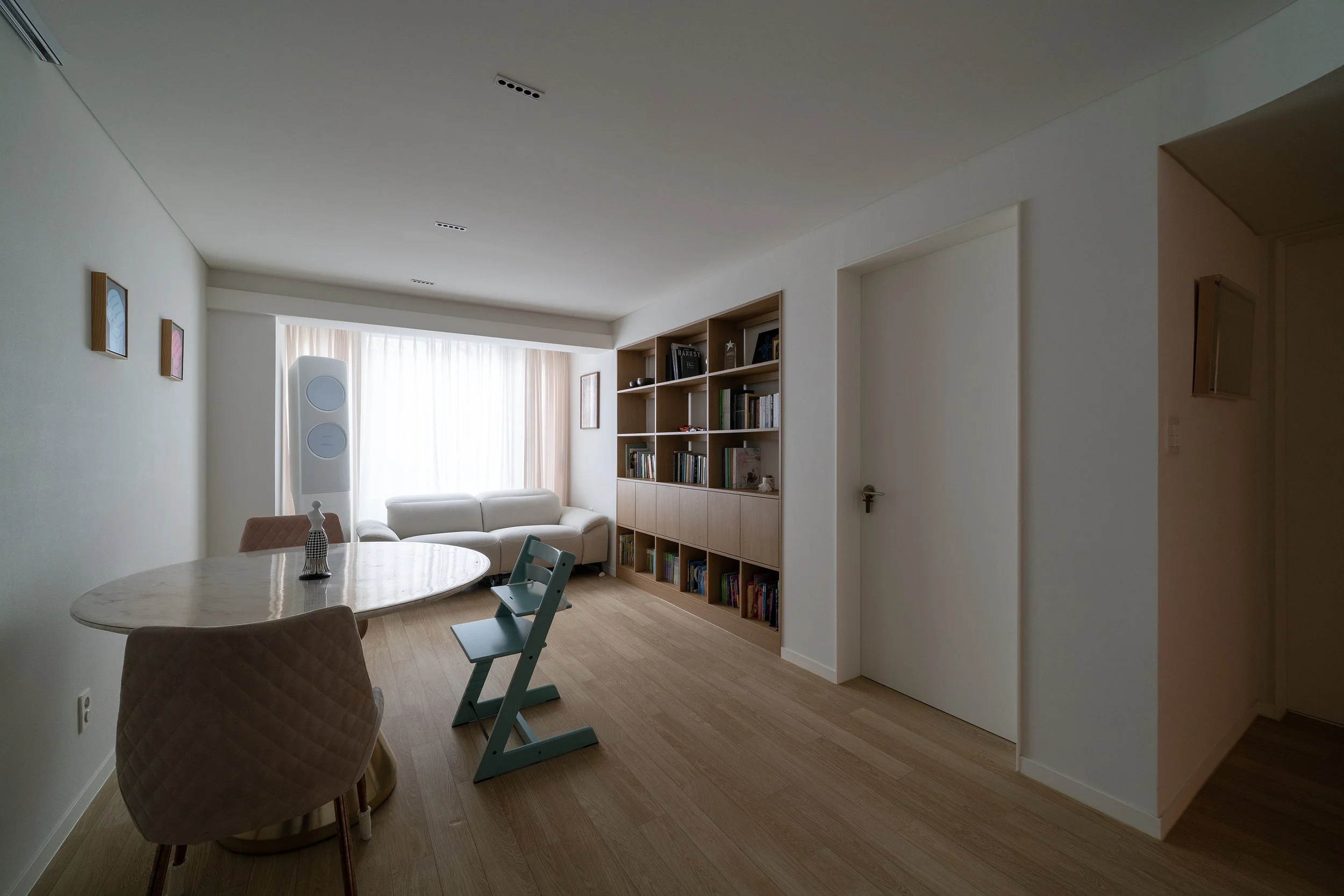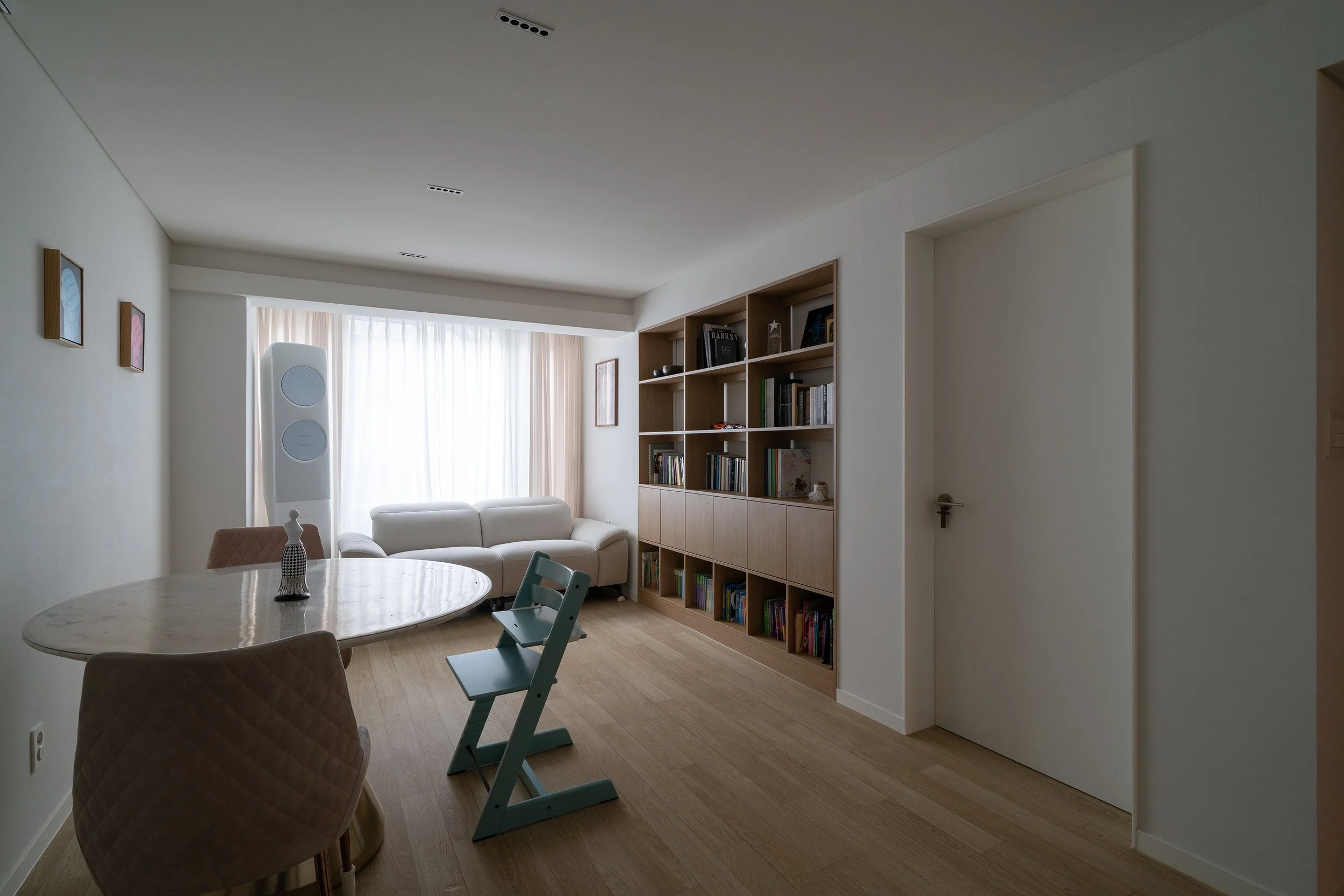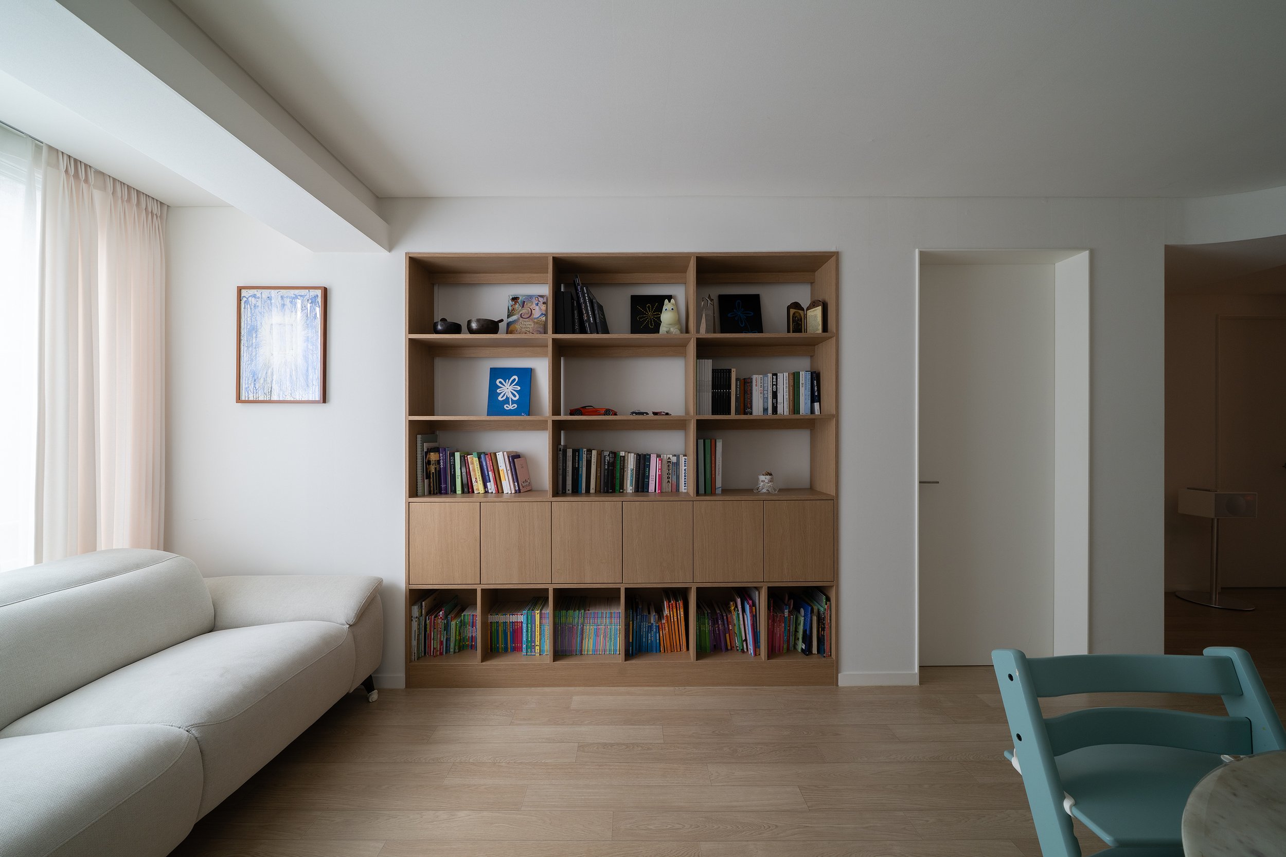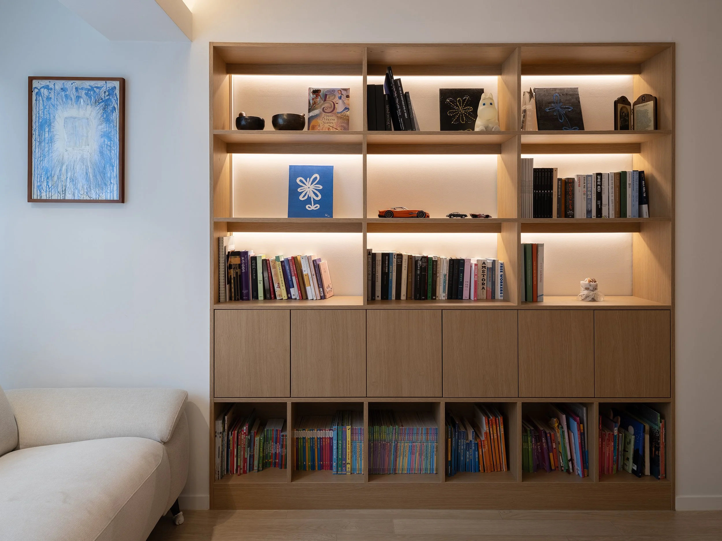 식탁과 카우치 외 별도의 집기가구를 배치하기 협소한 거실의 관리와 장식을 위해 벽면에 책장과 하부장을 매립 설치하였다. 작은 천장을 그나마 넓어 보이기 천장조명을 다이닝 기능을 중심으로 최소한으로 사용하여 천장면을 깨끗하게 유지하고 책장 간접조명의 측광을 활용하여 부족한 조도를 확보하였다.