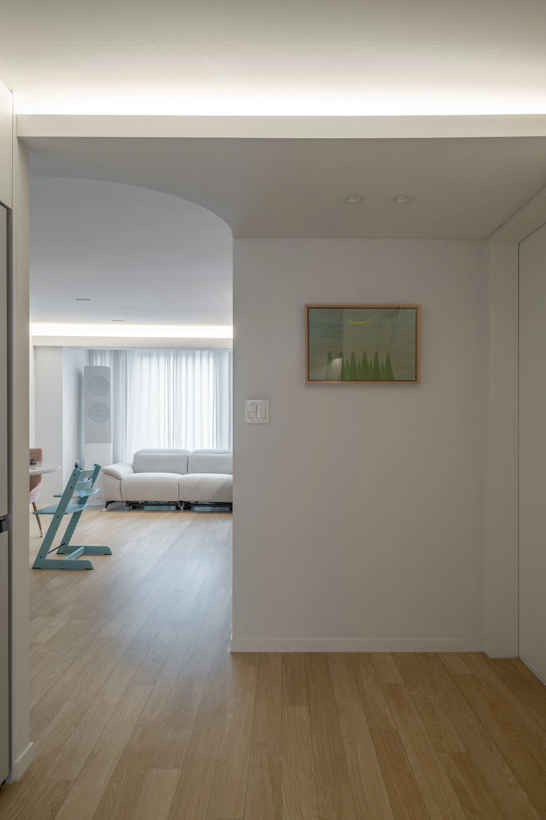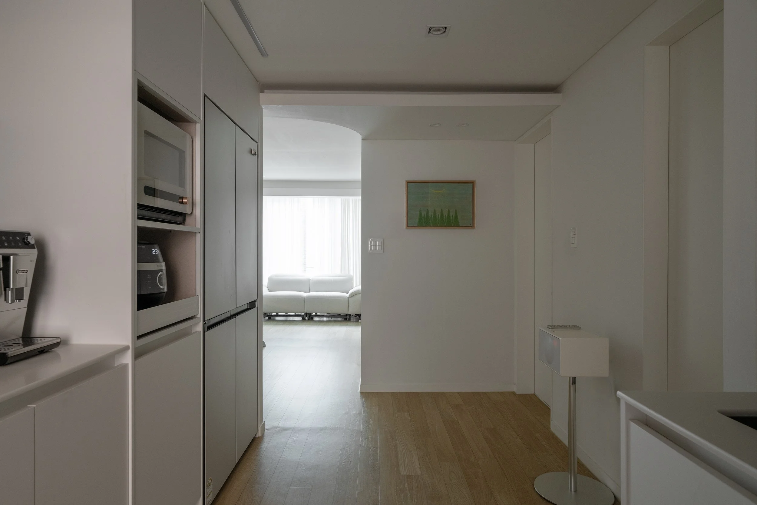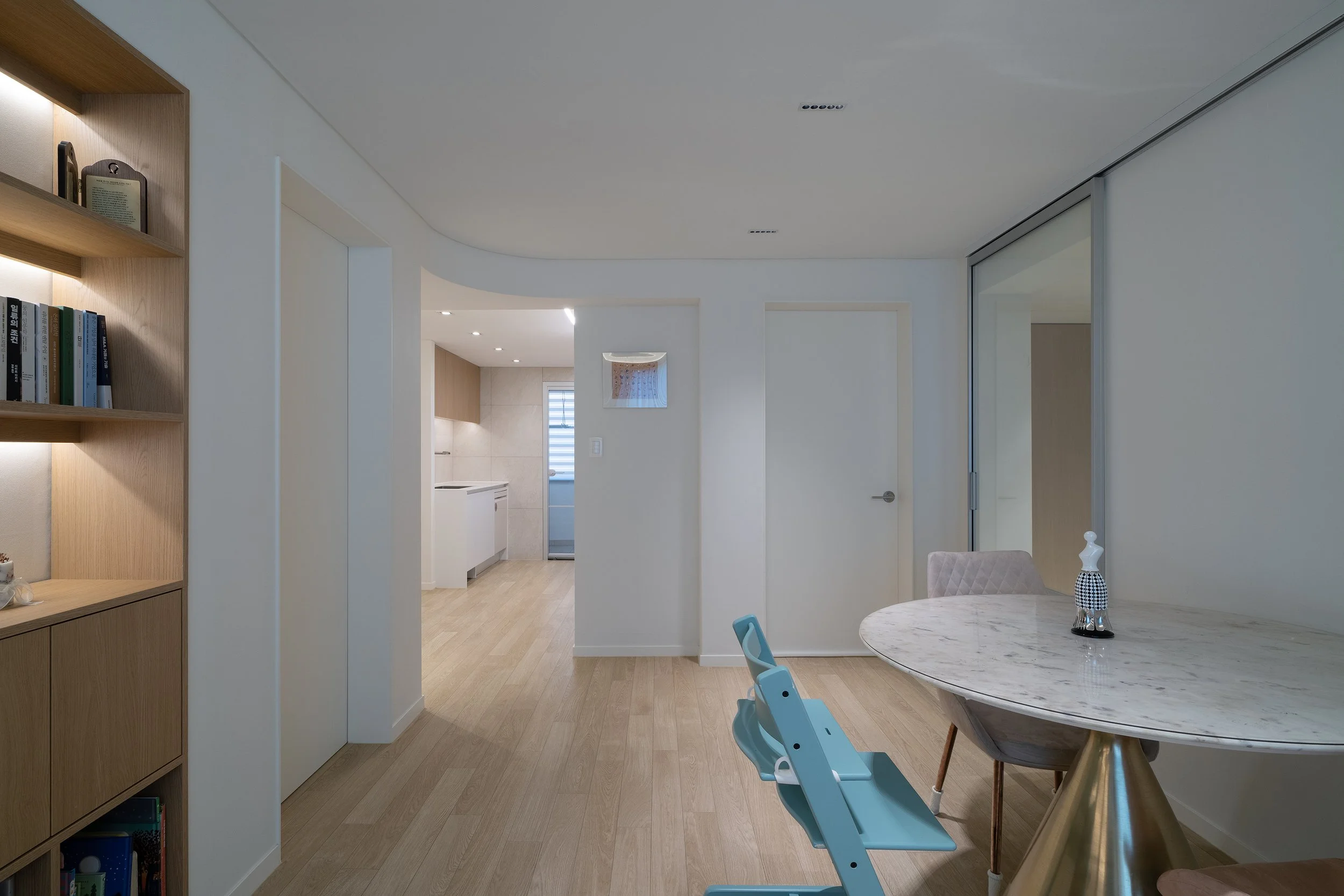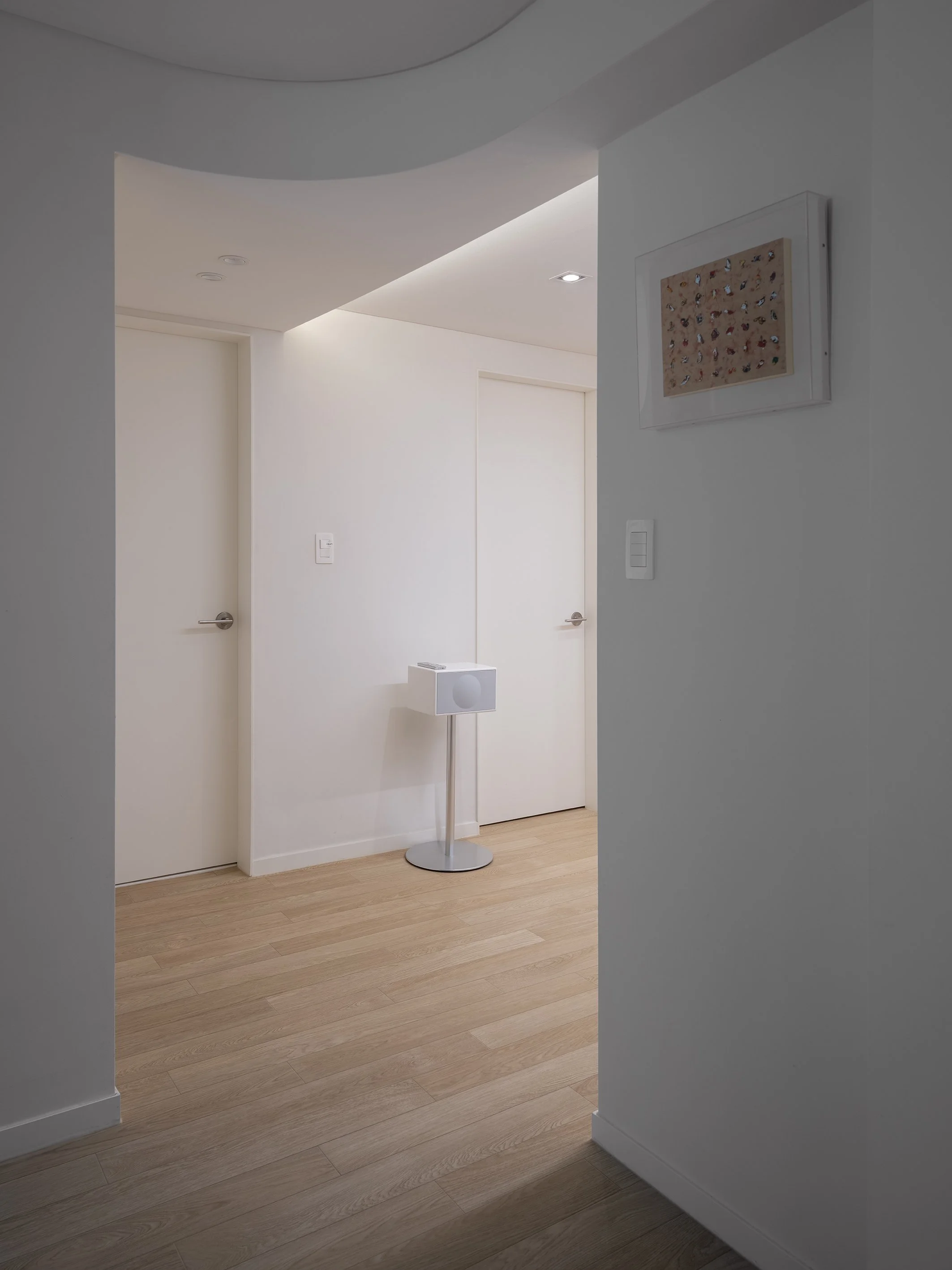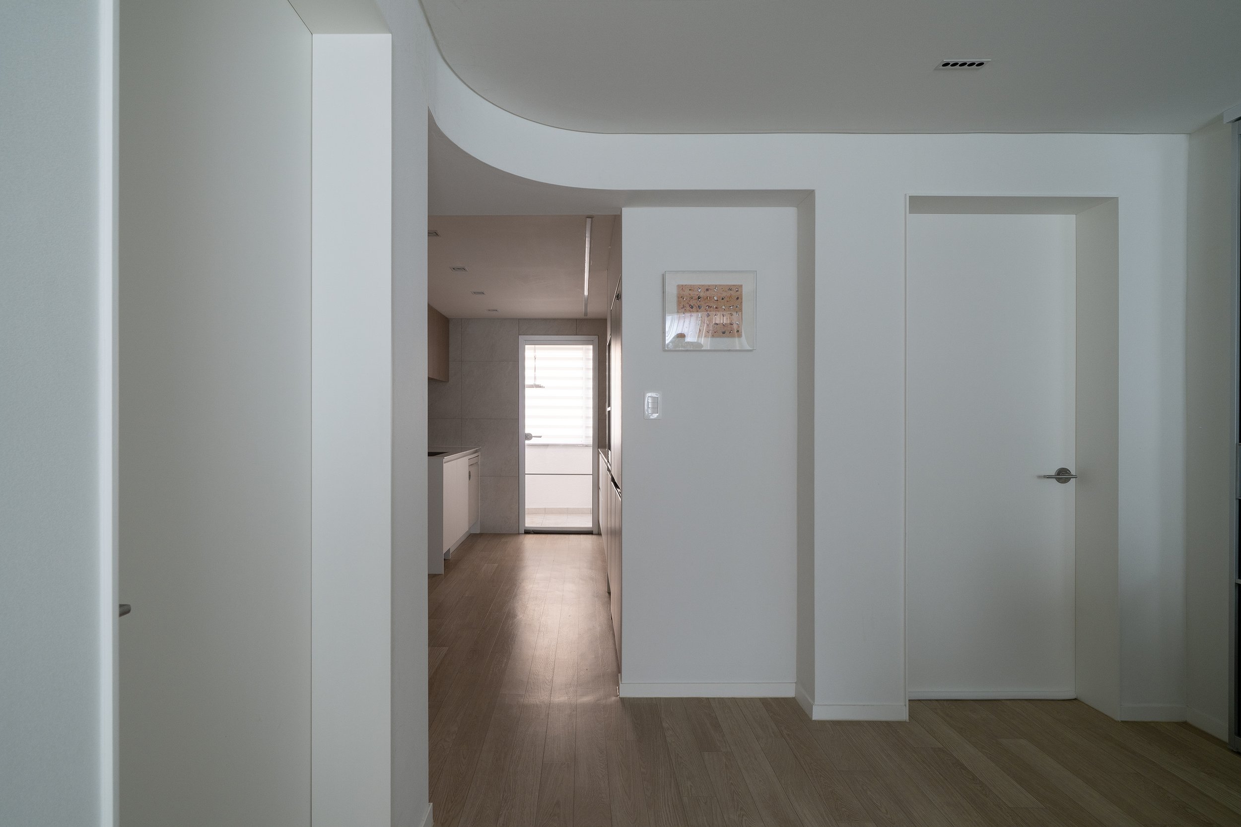 거실/다이닝과 주방 사이의 공간, 즉 욕실 진입을 위한 공간을 복도로 규정하고 천장고를 의도적으로 약 150mm 낮추고 단차이로 형성되는 상부 벽체를 곡면화하였다.