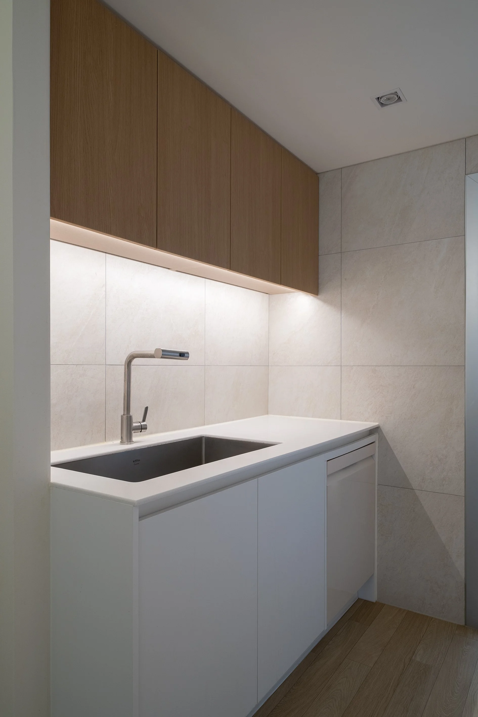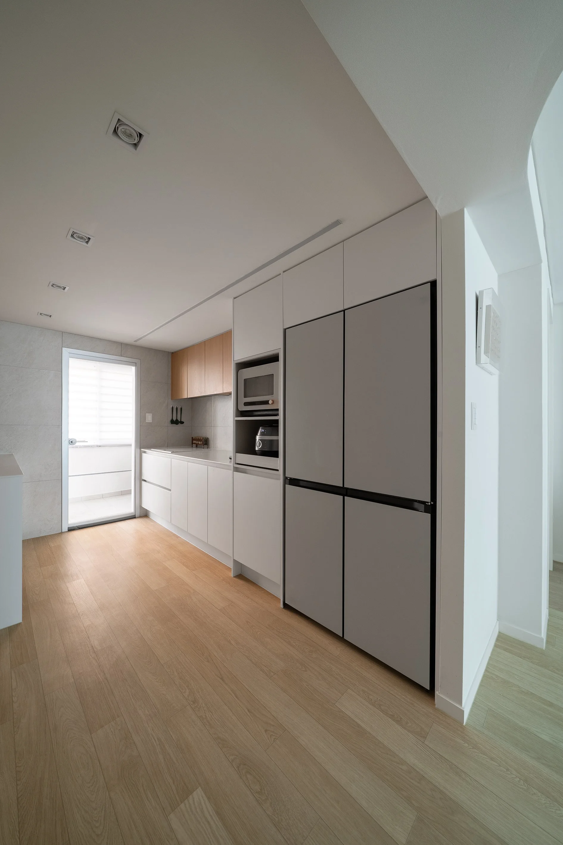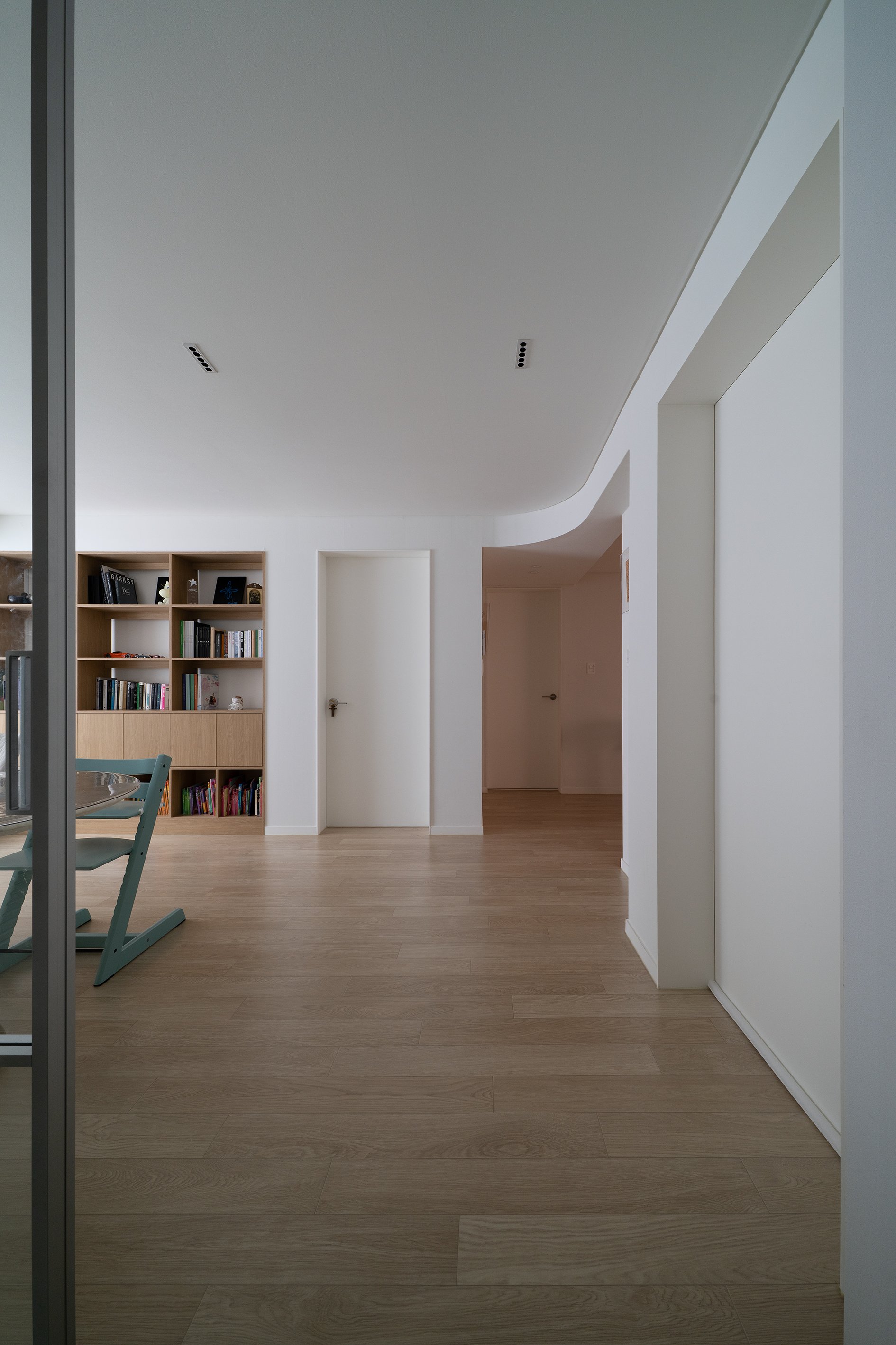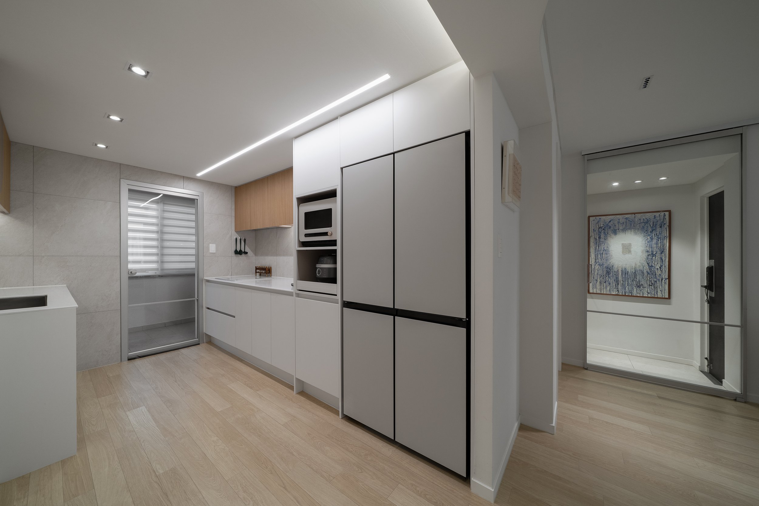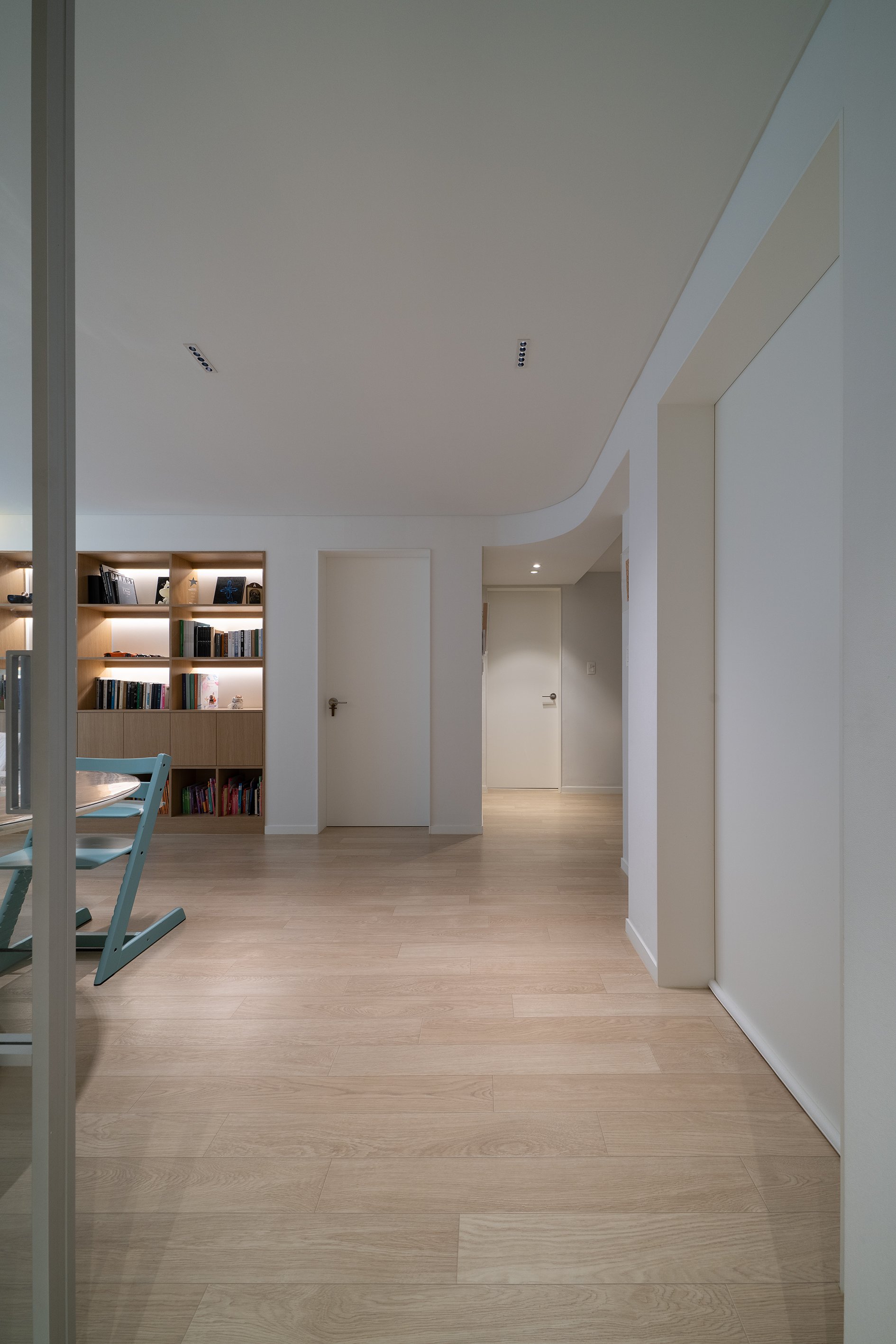 거실/다이닝과 주방 사이의 공간, 즉 욕실 진입을 위한 공간을 복도로 규정하고 천장고를 의도적으로 약 150mm 낮추고 단차이로 형성되는 상부 벽체를 곡면화하였다.
