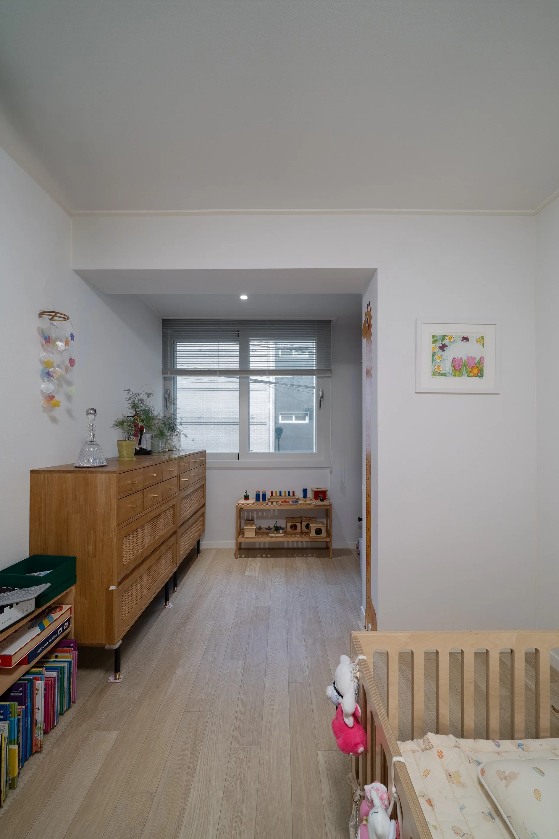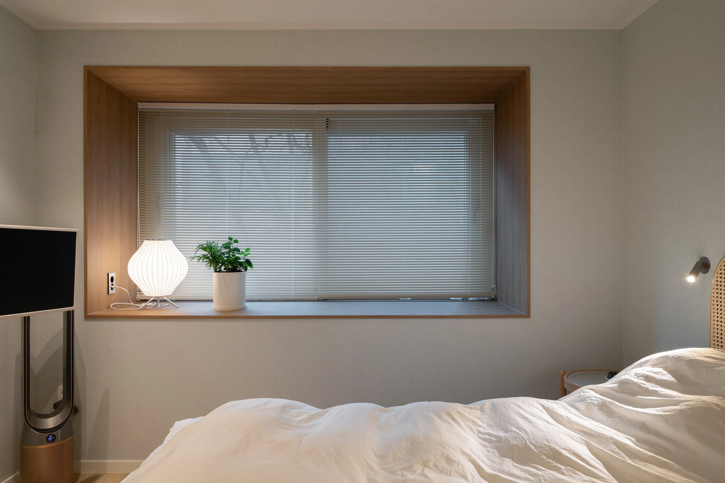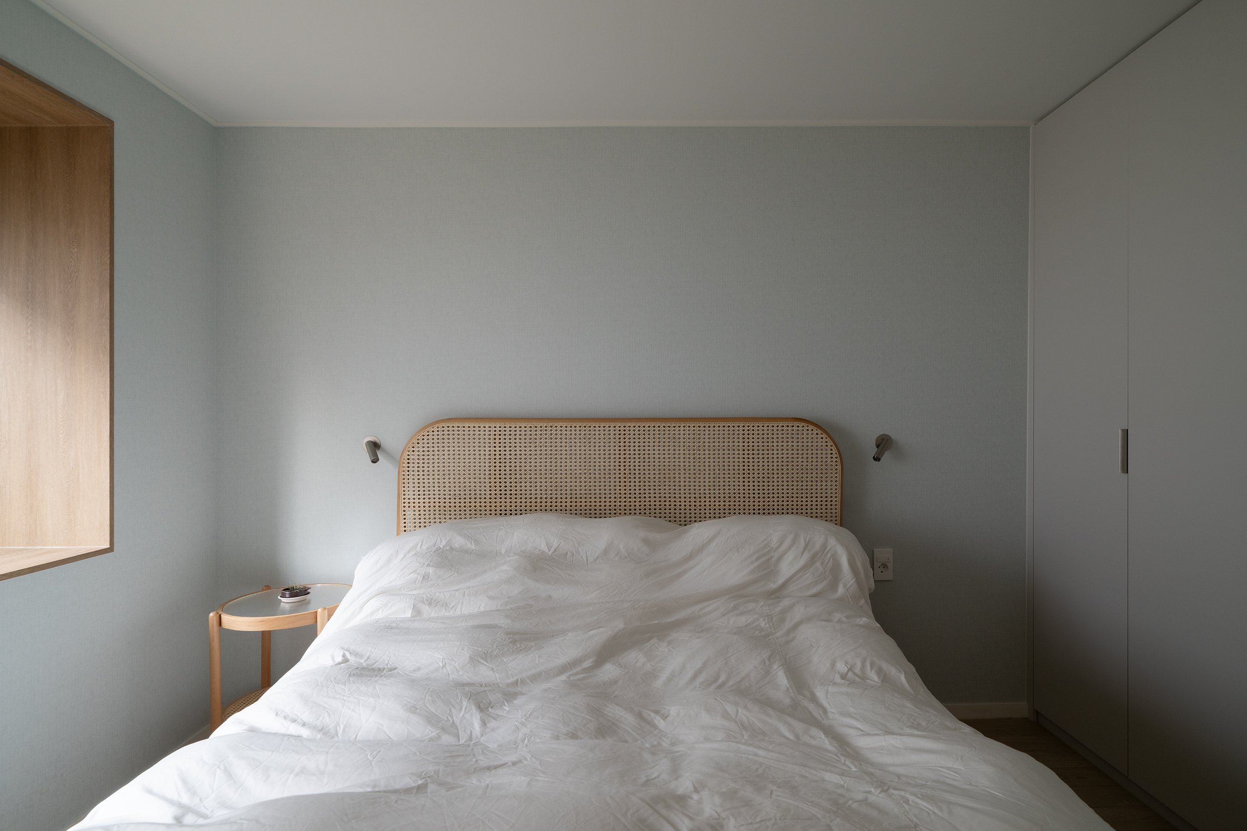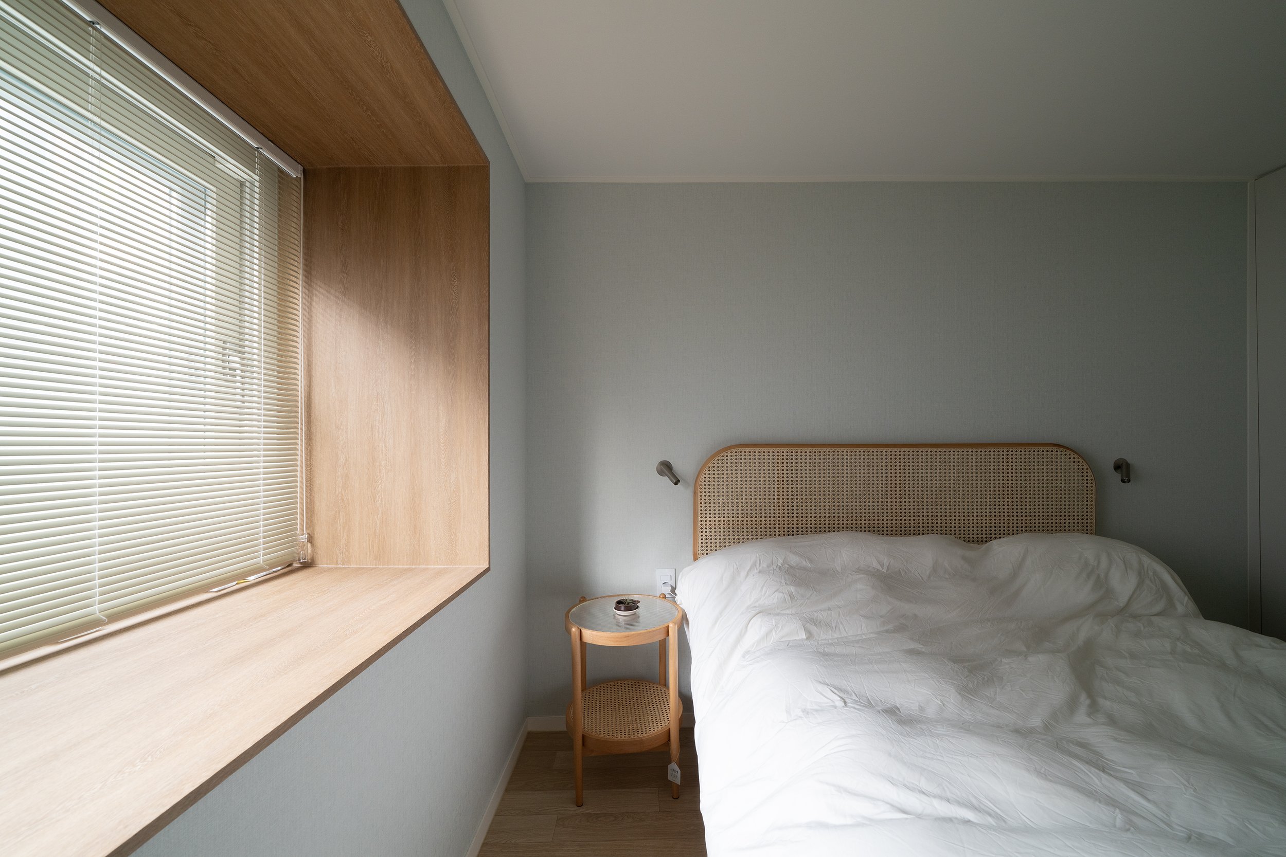 입구 침실을 제외하고 독특한 돌출 창이 있는 2개의 침실의 창호주변을 단열 보강하고 보드로 프레임을 둘러서 마감하였다. 두 침실 중 안방은 부드러운 무늬목 시트로 마감하고 청회색 벽지와 색 조화를 연출하였다.