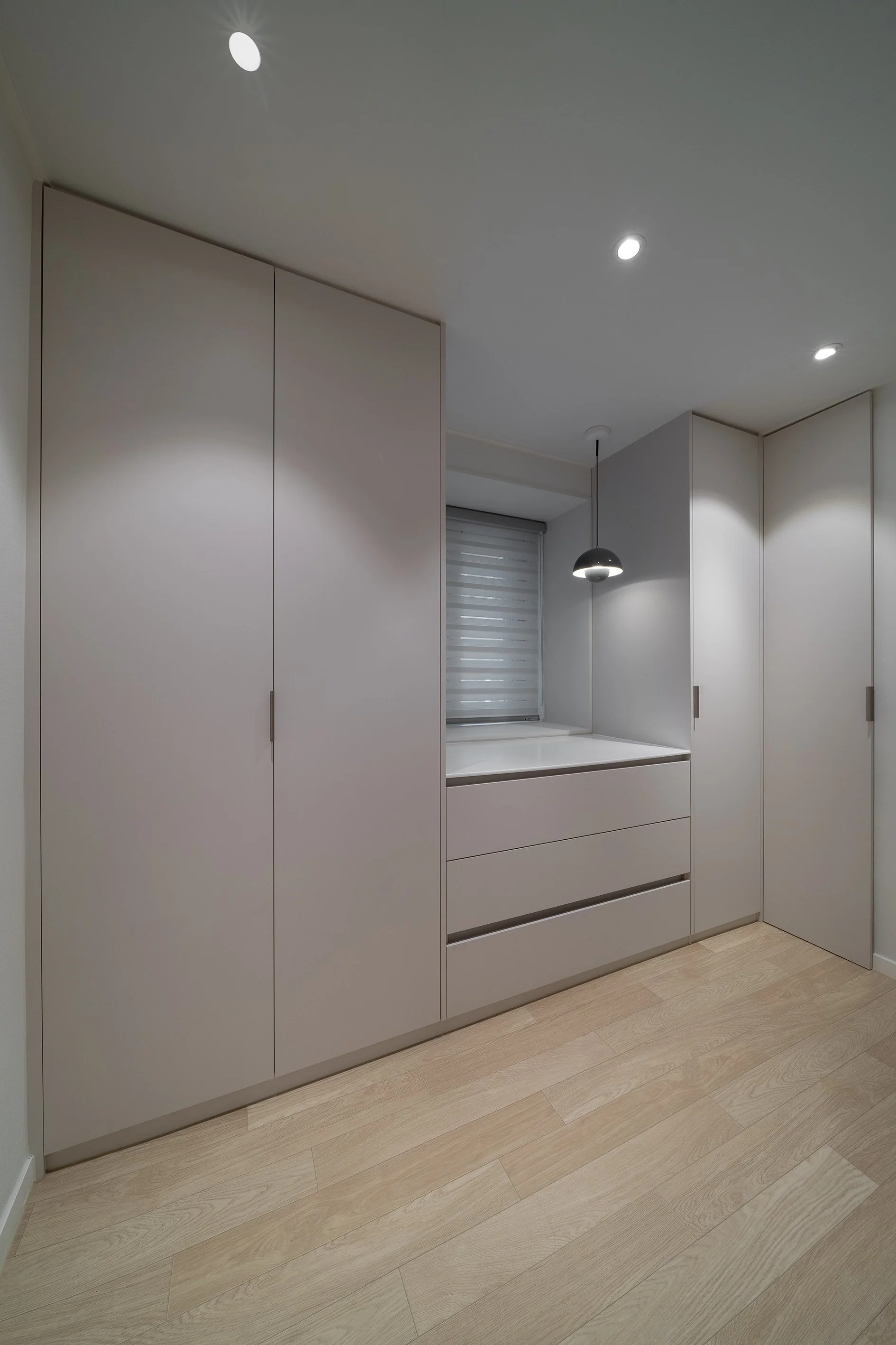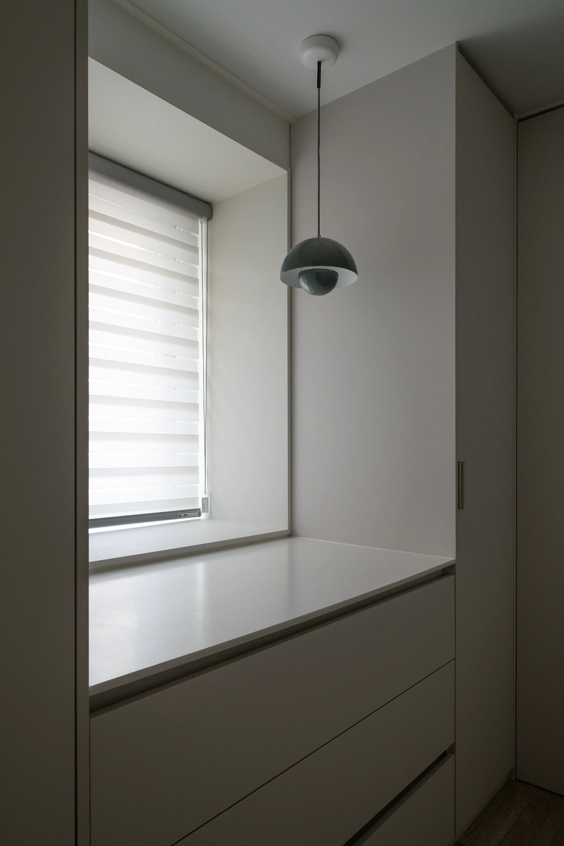 주방 옆 침실은 침실 중 가장 협소하여 창호 양옆에 옷장과 하부에 서랍장을 설치하였다.
