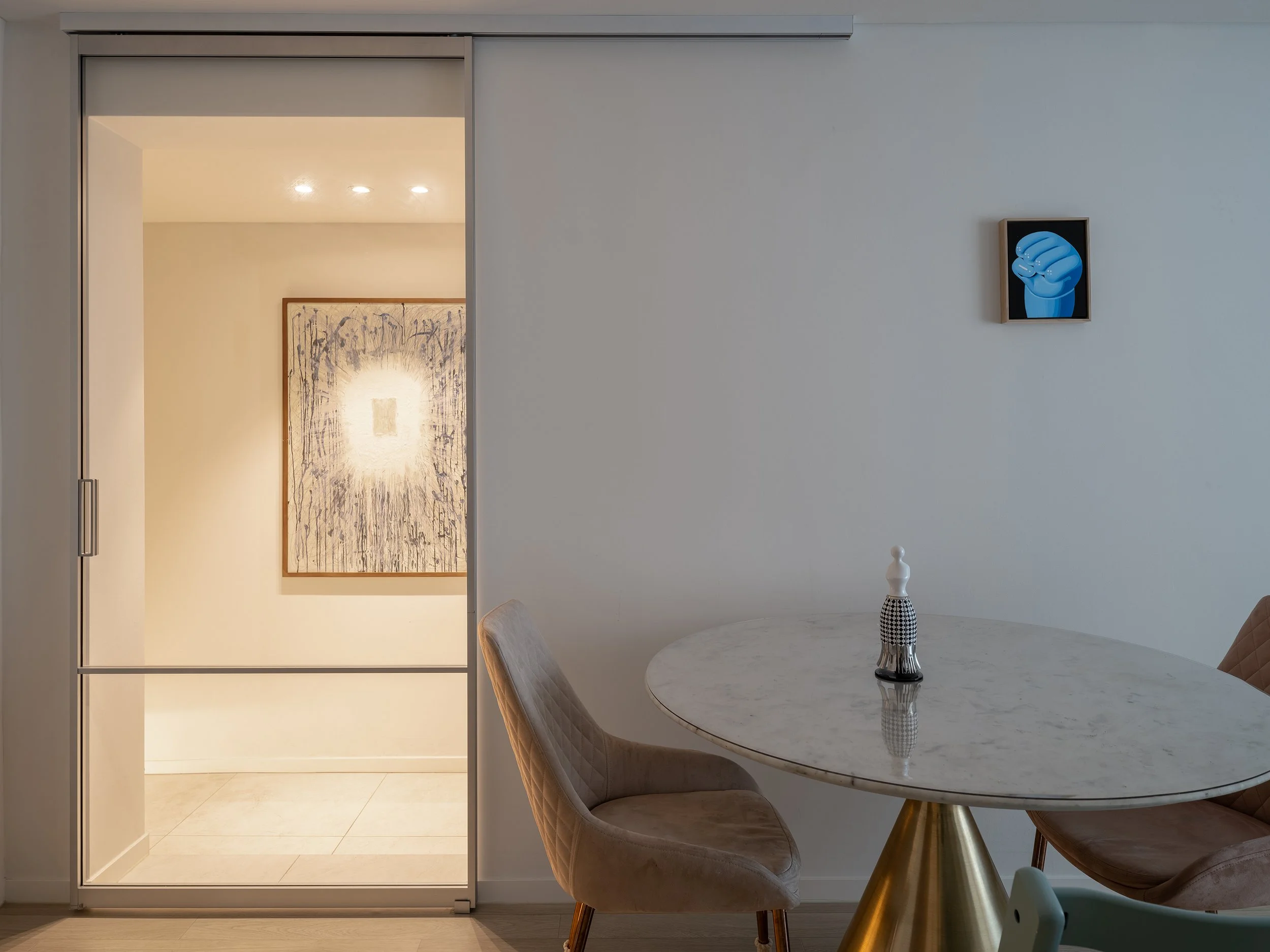 중문을 통해 보이는 현관의 정면 벽체에 아트웍을 설치하여 고급스러움을 더하였다.